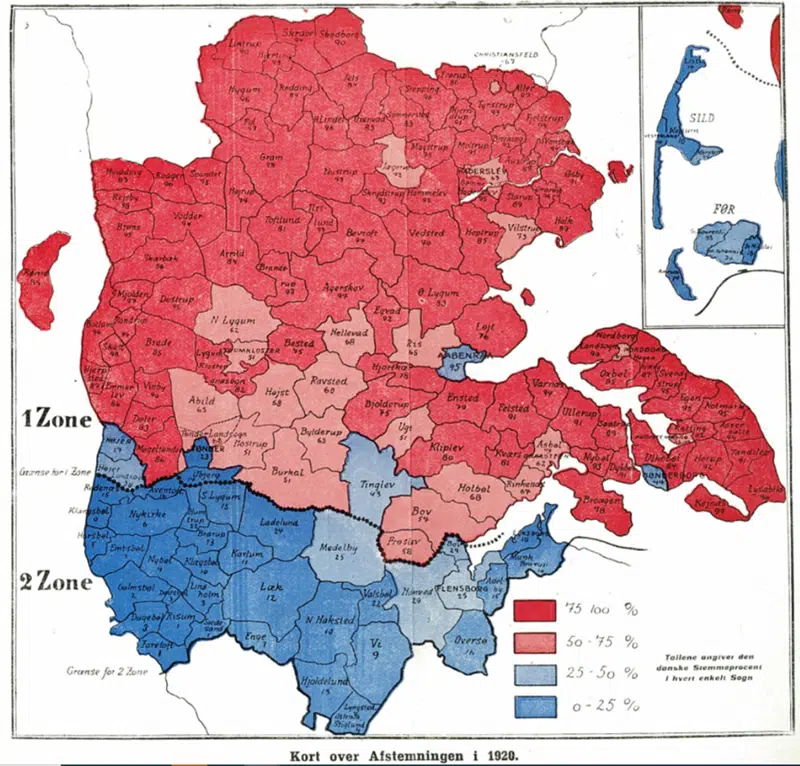 Kort over afstemningen i 1920, der viser, at der i de nordligste sogne og på vest-og østkysten af Jylland ned til nuværende grænse ofte blev stemt 75-100 procent dansk. I midten og ned mod grænsen var der 50-75 procent stemmer for dansk tilhørsforhold. I Åbenrå og Tinglev, Sønderborg, Tønder og Højer samt syd for den nuværende grænse var der tysk flertal.