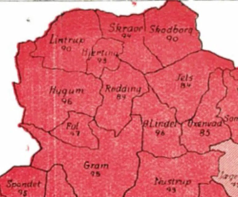 Kortet viser stemmeprocenten, der stemte for dansk tilhørsforhold i følgende kredse: Lintrup 90, Skrave 94, Hjerting 93, Skodborg 90, Hygum 96. Rødding 84, Jels 84, Fole 97, Øster Lindet 96, Gram 95, Ørenvad 85.